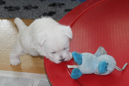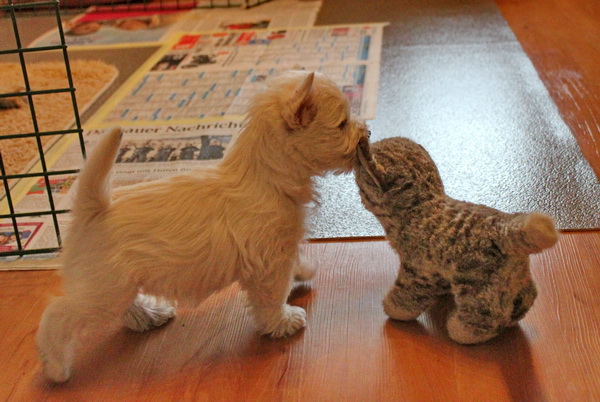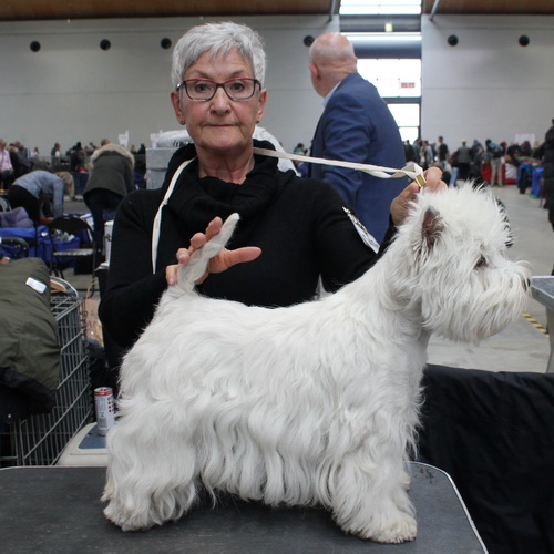 Lynn macht uns sehr viel Freude! Auf der Ausstellung in Ludwigshafen zeigte sie sich bestens, war mit Eifer dabei und konnte vor ihren Konkurrentinnen überzeugen - sie erhielt V1, die Jugendanwartschaften und wurde Bester Westie-Junghund.