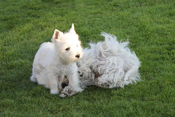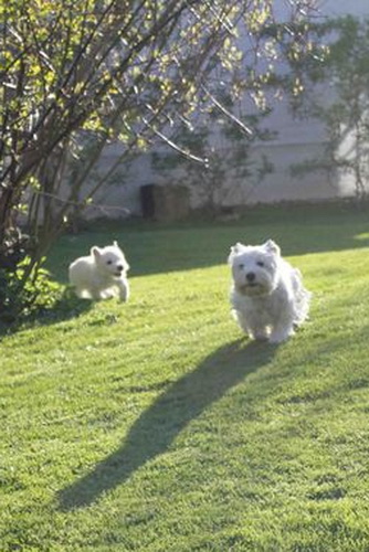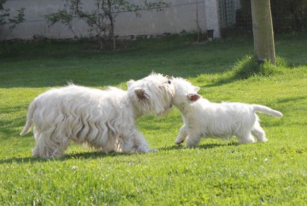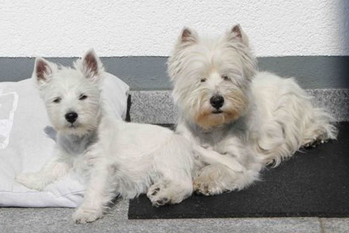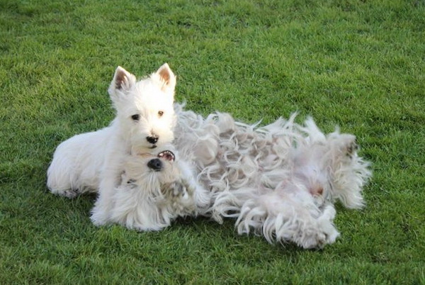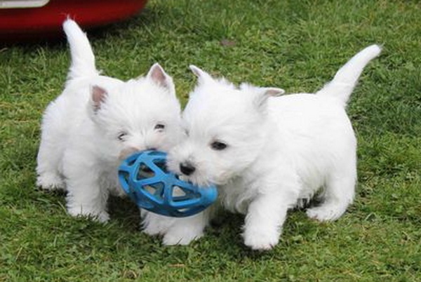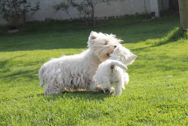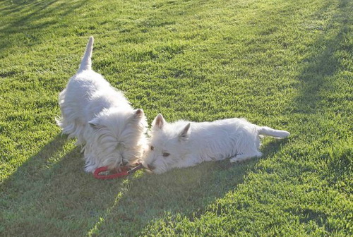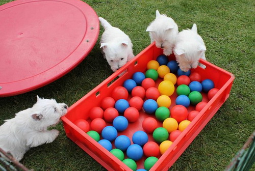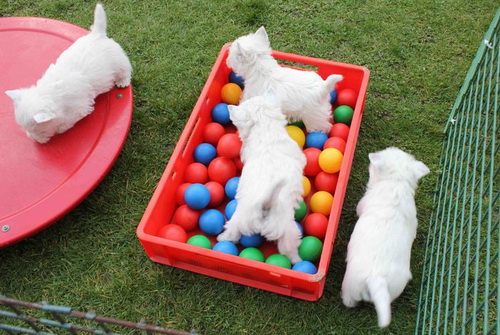 Die Welpen sind jetzt das erste Mal gebürstet und getrimmt worden. Sie haben ohne Probleme alles mit sich machen lassen. Als Belohnung gab's ein neues Spielzeug.